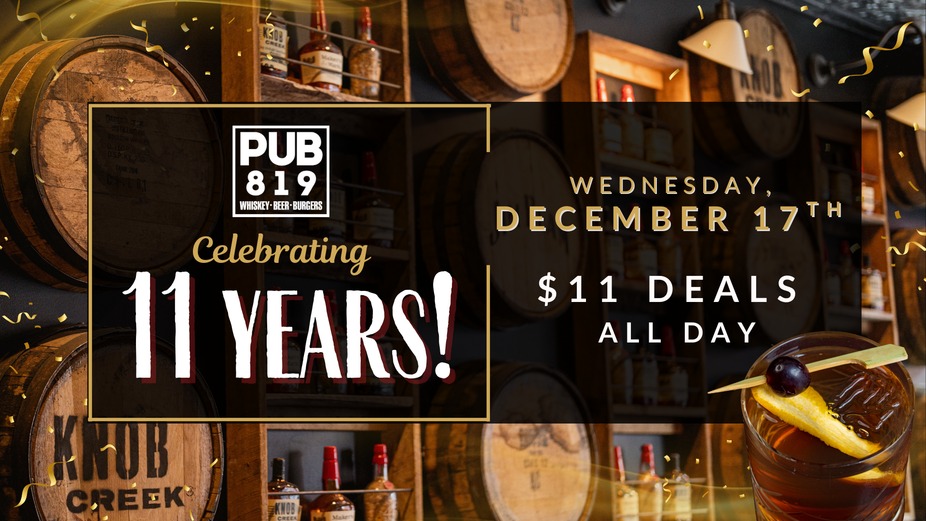 Celebrating 11 years with $11 Pub 819 classics: Old Fashioneds, Hopkins Berry, Totchos, and our Hopkins Smashed Burger. Valid all day, dine-in only.